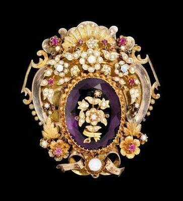 Set with a large oval faceted amethyst mounted with gold with seed pearls and rubies.