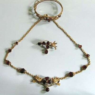 Including a necklace, bracelet, and pin all with oval faceted garnets and figures of doves.