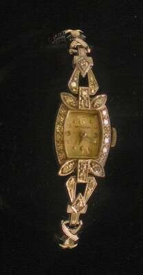 Having an oblong case, set with twenty-six small round diamonds with an expandable bracelet.