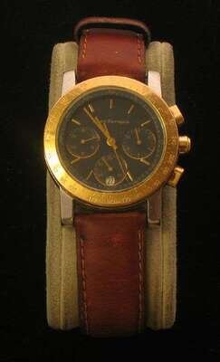 Circular case with numbered bezel and inner bezel, sweep stop second hanc three subsidiary dials with arabic numeral chapter rings and callendar dial. Leather bracelet. Includes extra leather and felt case.
