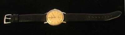Having a circular steel case with "bar" chapter ring, seconds hand. Model number 27-AM-400, serial number 732 071. Leather bracelet.
