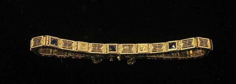 Set with two diamonds and three square cut sapphires.