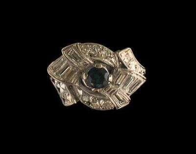 Center round sapphire about .45 carats with eight baguette diamonds and six round diamonds.