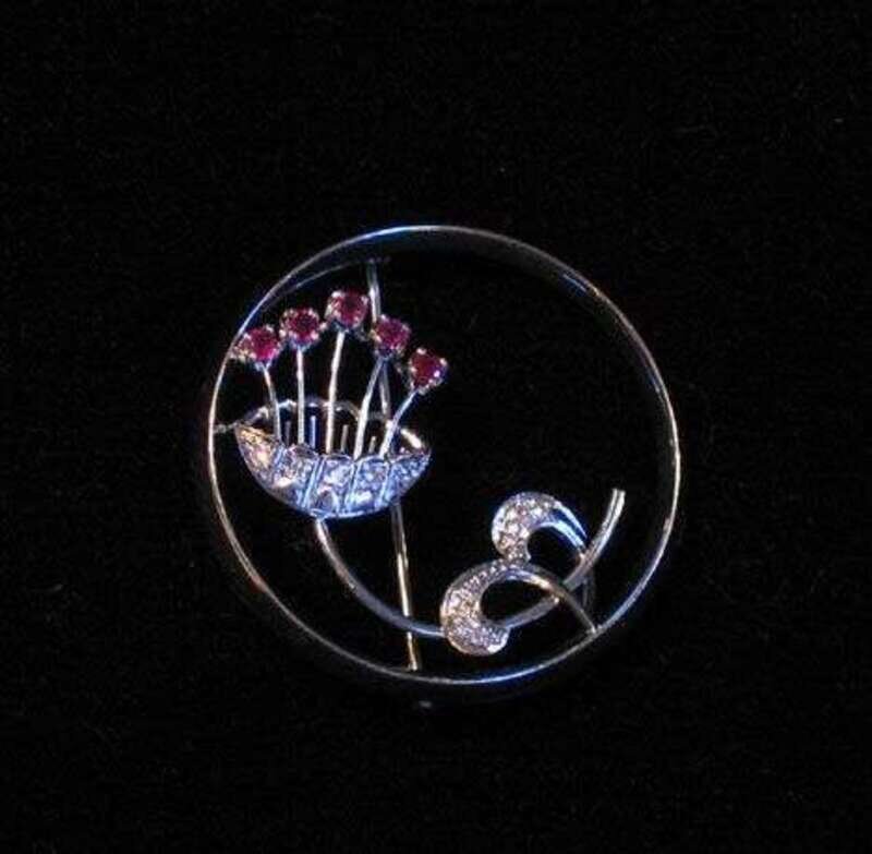 14 karat white gold diamond and ruby circle pin