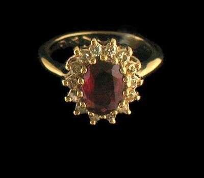 Oval ruby of about 1.35 carats surrounded with fourteen diamonds.