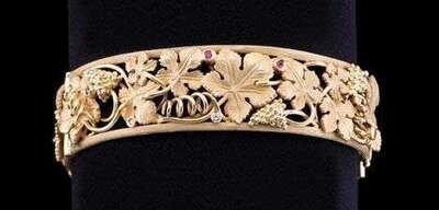 Decorated with grape bunches and leaves set with eight round rubies and seven small diamonds.