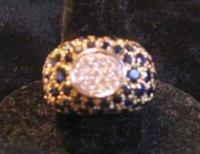 Center set with nineteen round diamonds and sixty one round sapphires.