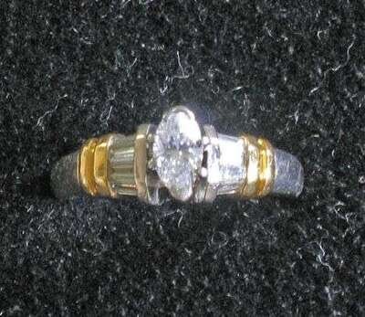 Centering upon a marquise-cut diamond, weighing approximately 0.30 carat, flanked by baguette-cut diamond shoulders. Eight baguette-cut diamonds, weighing approximately 0.30 carats total.