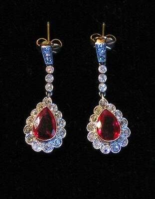Each drop set with a pear shaped ruby weighing about 0.95 carat surrounded by thirteen round diamonds, six diamonds above.