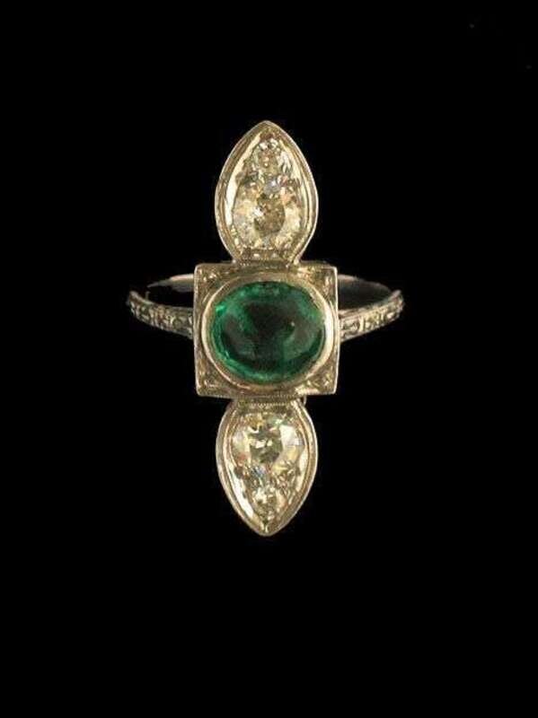 Round cabochon emerald about .80 carats and four graduated diamonds.