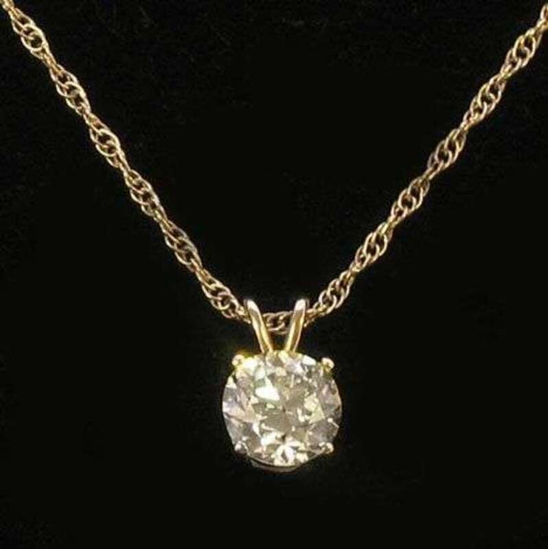Pendant set with a round diamond of about 1.55 carats in a four prong setting on a fine neck chain.