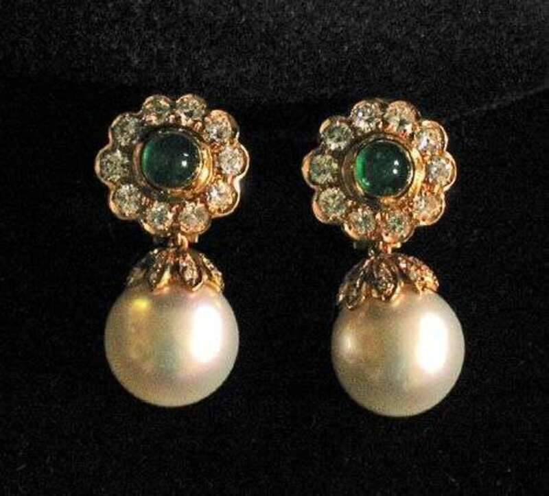 Pair of 18 karat yellow gold South Seas pearl and diamond earrings