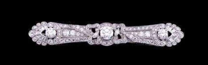 The single, marquise and baguette-cut diamond elongated plaque centering three circular-cut diamonds, center diamond weighs approximately 1.00 carat; side diamonds weigh approximately 3.15 carats; remaining diamonds weigh approximately 3.15 carats total.