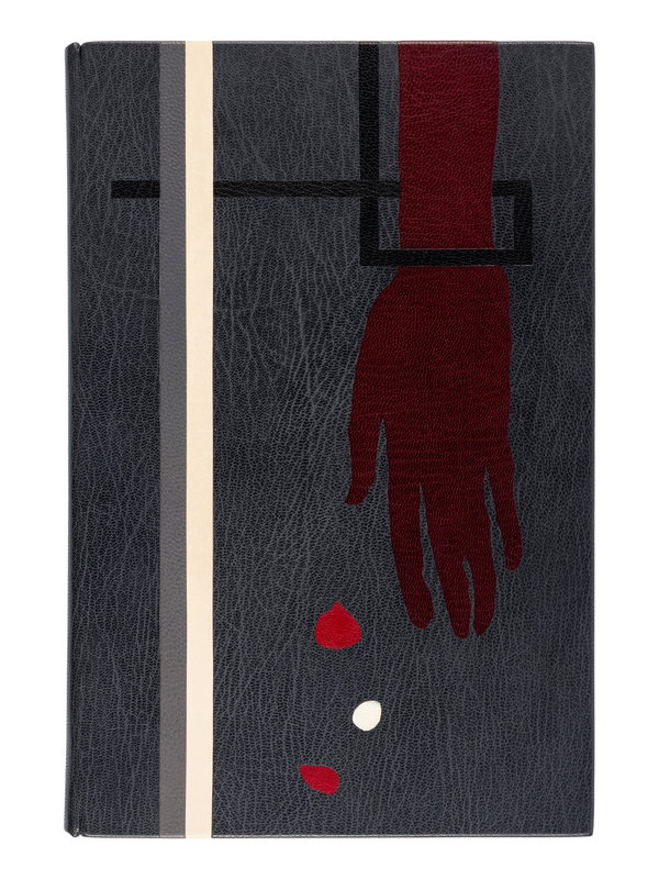 8vo. Illustrations by Zhenya Gay. 20th-century gray crushed levant, upper cover with maroon, red, white and black levant onlays depicting a hand in a shackle with grey and white morocco and calf vertical rule onlays, spine gilt-lettered, edges gilt, red suede doublures, black calf endleaves, BOUND BY DEREK HOOD with his blind monogrammed stamp "DH" on lower turn-in; board slipcase.