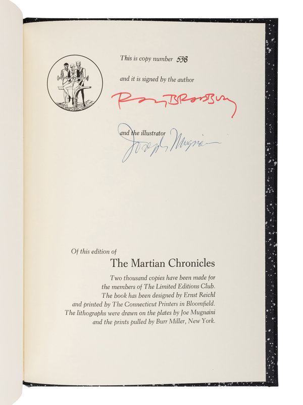 LIMITED EDITION, number 538 of 2,000 copies, SIGNED BY BOTH BRADBURY AND MUGNAINI. First published in 1950, The Martian Chronicles sold more than 3 million copies by 1979 and upon publication was "embraced by the science-fiction community as well as critics, a rare achievement for the genre. Christopher Isherwood hailed Bradbury as 'truly original' and a 'very great and unusual talent' (Weller). Newman 480; Sam Weller, "Ray Bradbury, the Art of Fiction No. 203, The Paris Review.