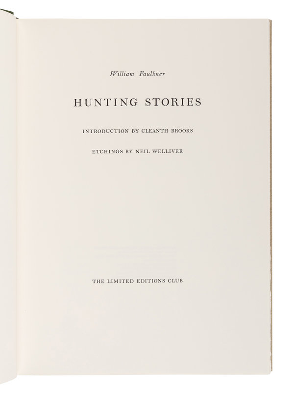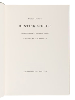 [With:] FAULKNER, William. Hunting Stories. Neil WELLIVER, illustrator. New York: The Limited Editions Club, 1988. 4to. Original morocco-backed cloth. LIMITED EDITION, number 620 of 750 copies, SIGNED BY WELLIVER.