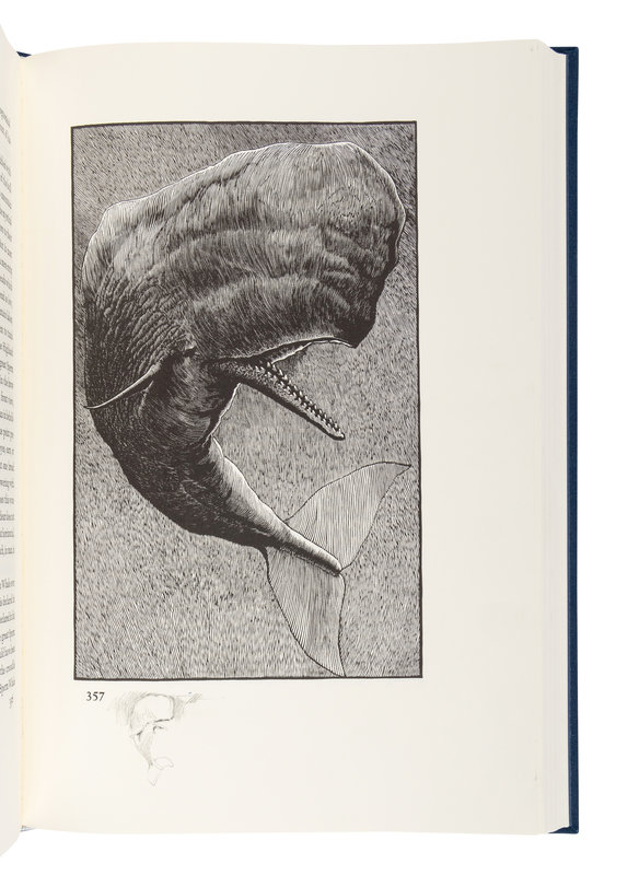 Folio. Woodcut illustrations by Barry Moser. WITH AN ORIGINAL REMARQUE BY MOSER in pencil of a whale, accomplished in the lower margin beneath his woodcut of the whale. Original blue cloth, spine lettered in silver; slipcase (slightly bumped).