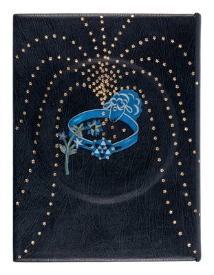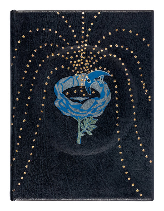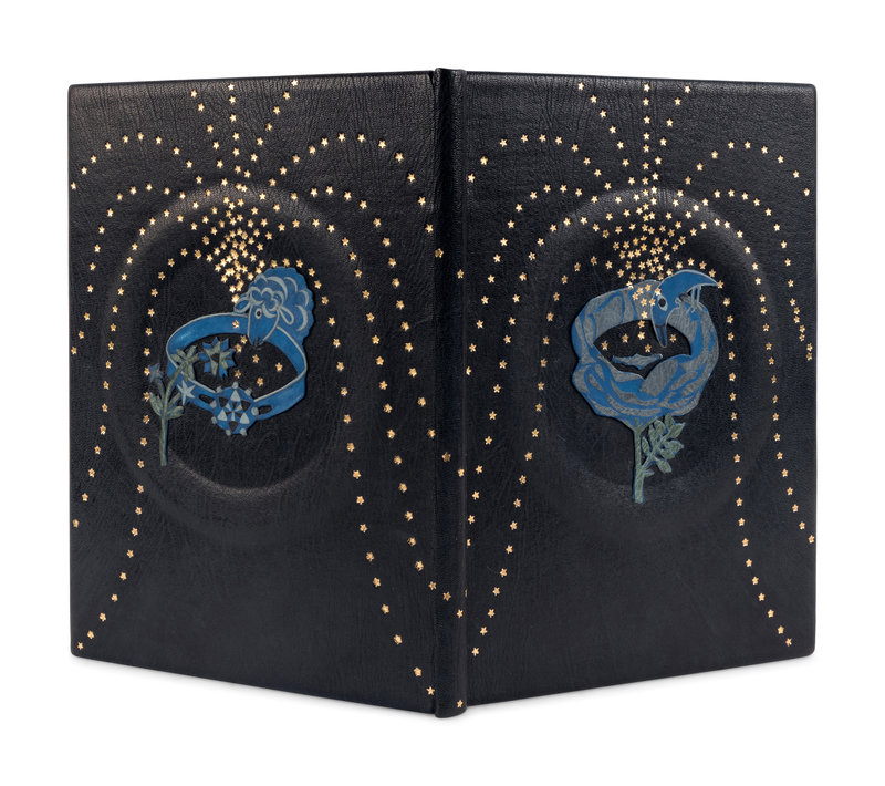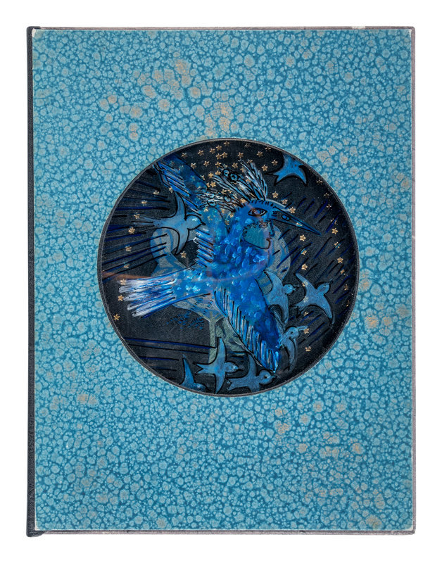 8vo. BOUND BY JAN SOBOTA: Contemporary blue niger, each cover set with central circle in relief, a star pattern emanating from central relief onlaid figures, the upper cover with a flower set with a crescent moon, the lower cover with a belt set with a sheep, each with green, black or gray onlays and painted outlines; in folding case with central translucent oval with painted motif of the prince in bird costume surrounded by birds.