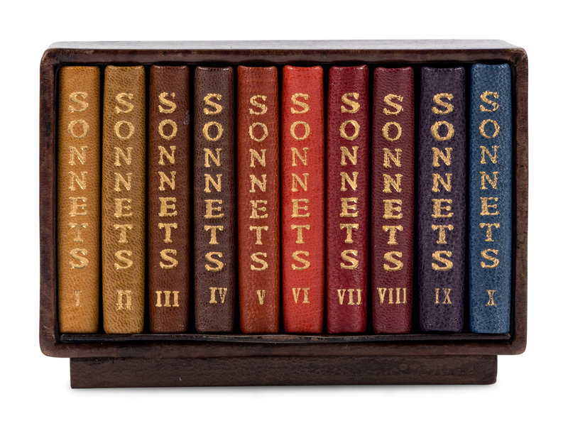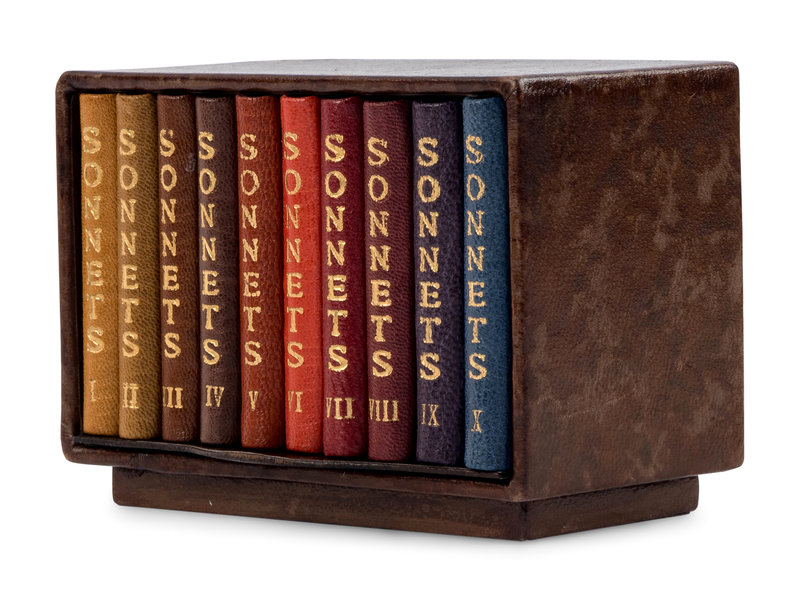 10 volumes, 32mo. BOUND BY JAN AND JARMILA SOBOTA: Contemporary morocco, each volume bound in different colors including tan, brown, russet, orange maroon, purple and blue, sides with allover blind-stamped "S" motif, spines gilt; all housed in a leather case.