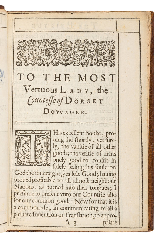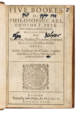 The first 17th-century translation of the Consolation, which heavily influenced the philosophy of late antiquity and Medieval and early Renaissance Christianity, translated by Elizabethan Jesuit Michael Walpole. ESTC S102854.
