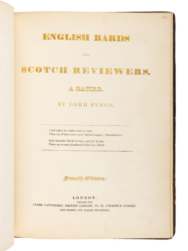 Text transcribed from the fourth edition, which was the last authorized by Byron. The text also includes Byron's Notes and the critique from the Edinburgh Review which promoted Byron's writing English Bards and Scotch Reviewers, and the transcription of "Windsor Poetics," a sonnet regarding the Prince Regent, later George IV, that was considered so savage that Bryon only allowed it to be circulated privately. The title-page was likely printed by James Whitaker, a London-based printer known for this gold printing. With the label of H. Dunn, possibly Henry Dunn (1776-1867), a Maltese shopkeeper in Livorno, Italy. According to tradition, Lord Byron was in Dunn's shop when he heard of Shelley's death (cf. Prothero edition of Byron's Letters and Journals, v. VI, p. 69n).