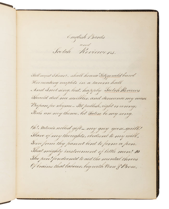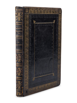 4to (266 x 203 mm). Title-page printed in gold and black (see below), 121pp. calligraphic cursive manuscript in brown ink in an unknown hand on lightly ruled pages. (Some light marginal toning.) Black Regency straight-grained morocco, sides decorated in blind and gilt, spine in 6 compartments with 5 raised bands, gilt-lettered in 2, the rest decorated in gilt and blind, edges gilt (covers detaching, some wear to extremities, some minor scuffing to sides). Provenance: H. Dunn (printed paper booklabel to front pastedown).