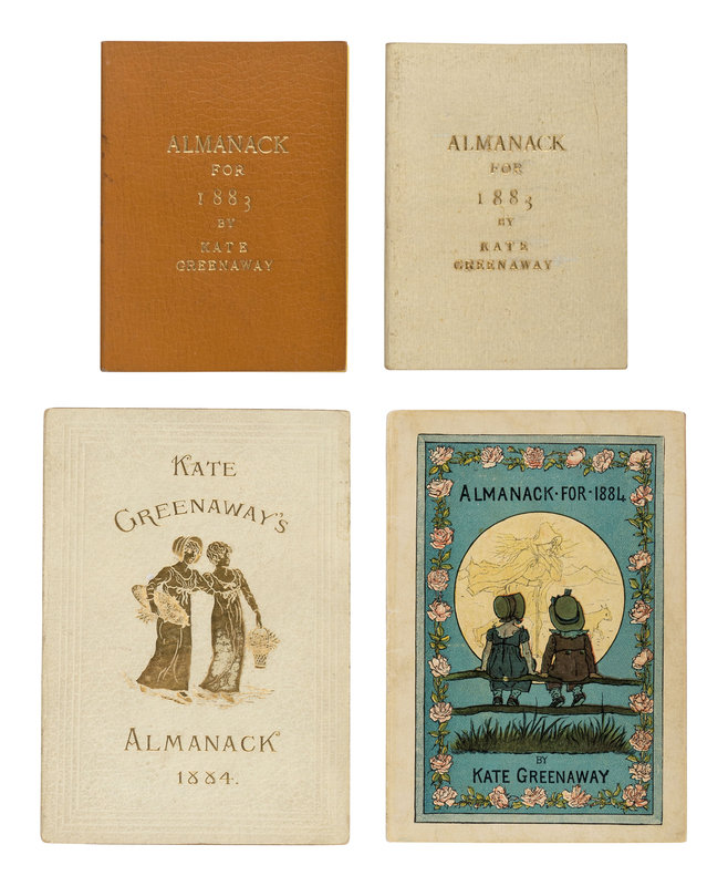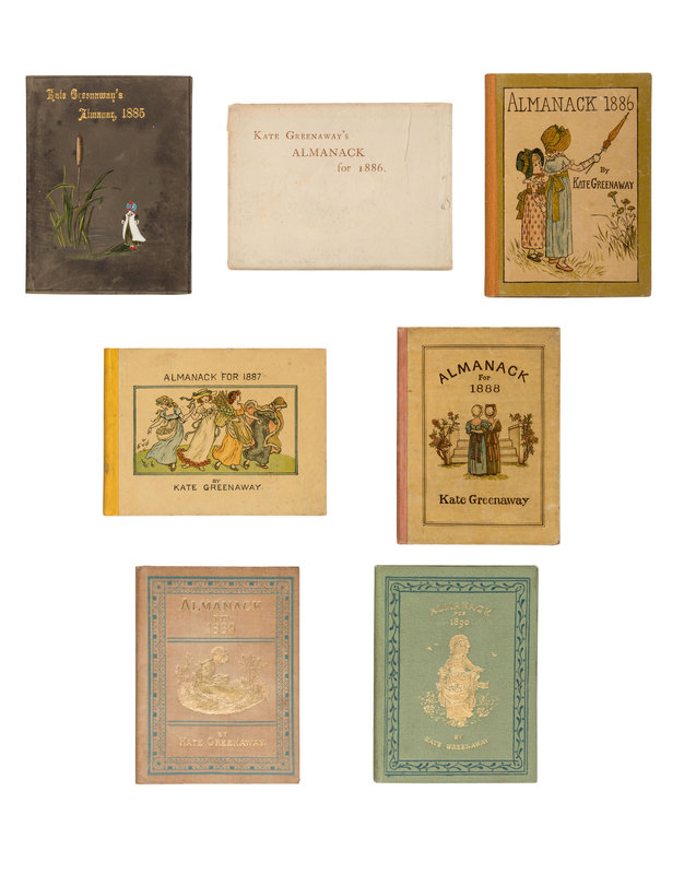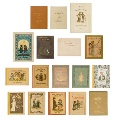 17 volumes (including two copies of 1883, 1884, and 1886), 24mo and 12mo. Illustrated by Greenaway. Various original and variant bindings of cloth-backed glazed pictorial boards, gilt-lettered imitation leather or cloth, some edges gilt; one copy of the 1886 Almanack in original dust jacket (overall some very light rubbing to a few volumes); red morocco-backed slipcase.