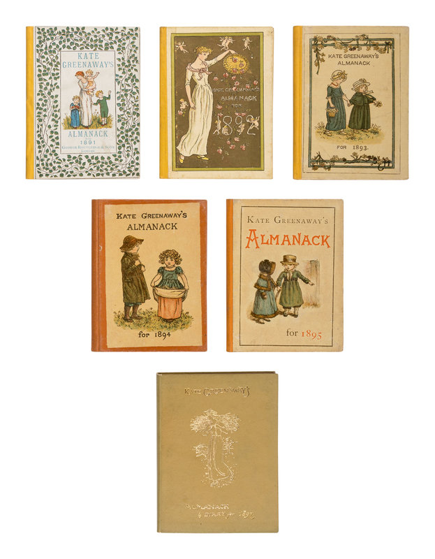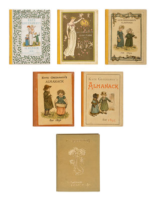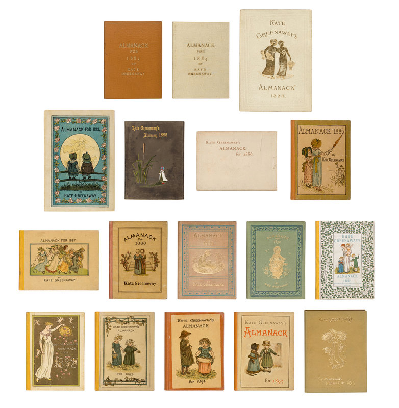 FIRST EDITIONS, A NEARLY COMPLETE SET (the publisher did not issue an Almanack for 1896), a few in variant bindings, ONE IN THE ORIGINAL DUST JACKET. "The beginning of 1883 had seen the publication of Kate Greenaway's first Almanack... it achieved an enormous success, some 90,000 copies being sold in England, America, France, and Germany. It was succeeded by an almanac every year (with but one exception, 1896) until 1897...There are various little conceits about these charming productions which are calculated to appeal to the 'licquorish chapman of such wares'; so that complete sets of them already fetch respectable sums from the collectors of beautiful books" (Spielman & Layard (1905), p. 122).