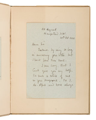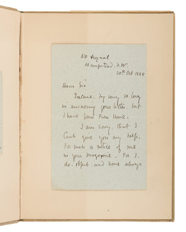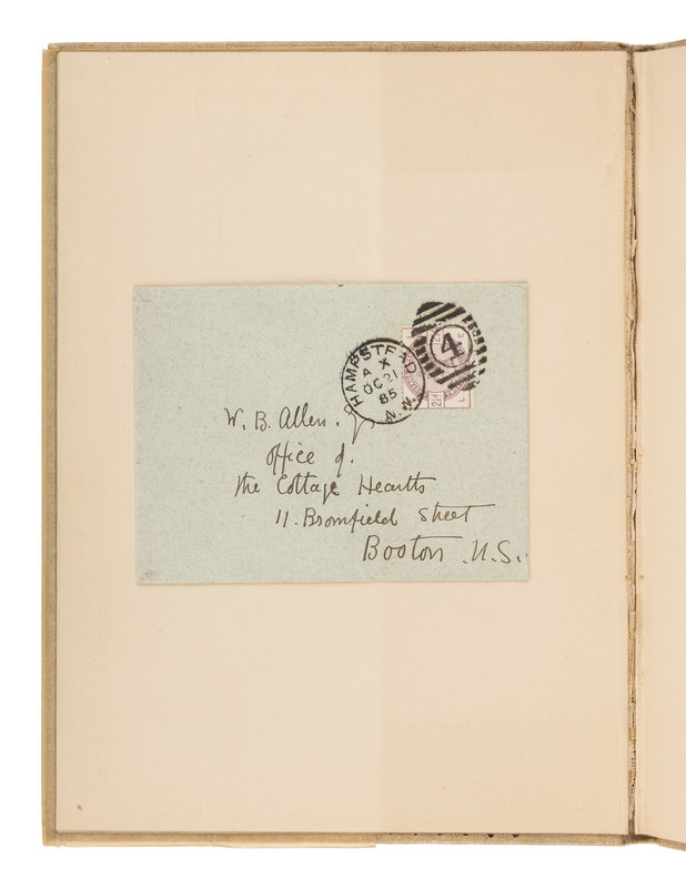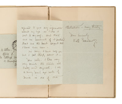 [With:] GREENAWAY, Kate. Autograph letter signed ("Kate Greenaway") to W.B. Allen. 20 October 1885. 2 pp., 12mo in ink, with original envelope. In part: "Excuse my being so long in answering your letter, but I have been from home. I am sorry that I can't give you any help for such a notice of me in your magazine, for I do object and have always refused to give any information about my life, as I like it best for myself."