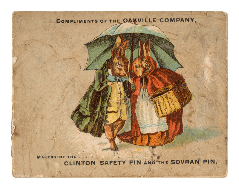 Oblong 24mo (83 x 105 mm). 8pp. 5 color-printed illustrations. Original printed stapled wrappers with advertisements including "Compliments of the Oakville Company Makers of the Clinton Safety Pin and the Sovran Pin" on the front cover (some soiling, a few very tiny chips, separations along spine fold).