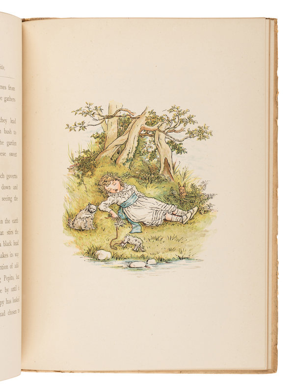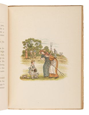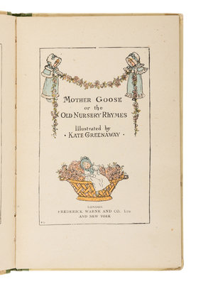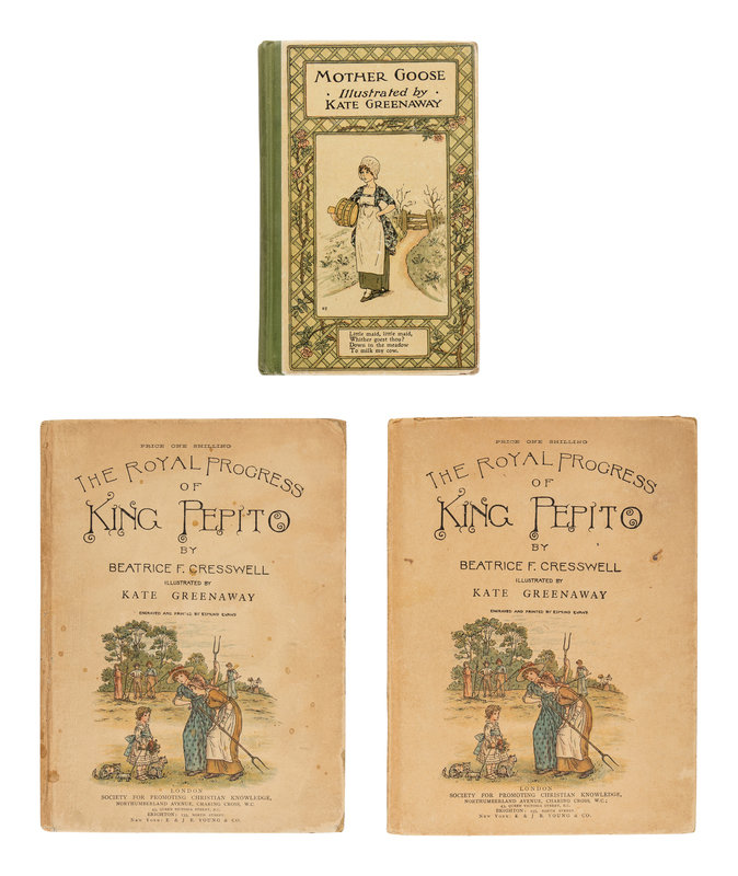 CRESSWELL, Beatrice F. GREENAWAY, Kate, illustrator. The Royal Progress of King Pepito. London: Society for Promoting Christian Knowledge, [1889]. Publisher's pictorial boards. FIRST EDITION. -- GREENAWAY, Kate, illustrator. Mother Goose or, The Old Nursery Rhymes. London: Frederick Warne & Co., [n.d.]. -- GRUELLE, Johnny. Raggedy Ann in the Deep Deep Woods. Joliet, IL: P.F. Volland & Company, 1930. Publisher's pictorial cloth; original box. FIRST EDITION. -- ORT, Jane. Mr. Mogo Mouse. Joliet, IL: P.F. Volland & Company, 1930. Publisher's pictorial cloth; original box. FIRST EDITION. -- The Shoe House Nursery Rhyme Book. New York: Novelty Import Company, Inc., 1957. Publisher's pictorial boards in shape of a shoe; shoe-shaped slipcase. FIRST EDITION. -- And 5 others. Together, 10 works in 10 volumes, various 8vo and 12mo sizes, condition generally fine. Complete list available upon request.