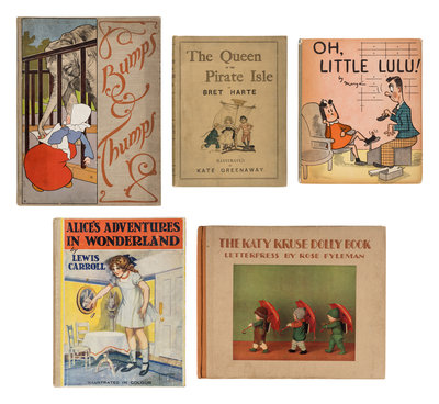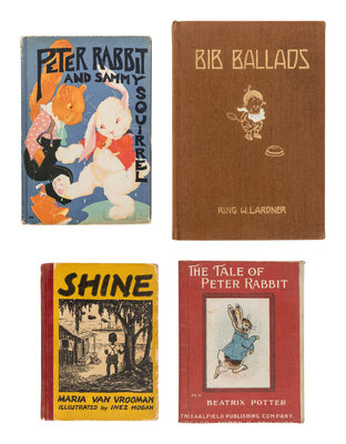 BRIDGMAN, L.J. Bumps and Thumps. New York: H.M. Caldwell, 1903. Publisher's cloth with full color pictorial label. -- GRAVES, Robert. Fairies and Fusiliers. New York: Alfred A. Knopf, 1918. Publisher's cloth. FIRST EDITION. -- HAWLEY, Katherine. Stories of the Quin-Tuplets. Racine, WI: Whitman Publishing Company, 1935. Publisher's cloth; dust jacket. -- LARDNER, Ring. Bib Ballads. Chicago: P.F. Volland & Co., 1915. Publisher's brown cloth gilt. FIRST EDITION. -- POTTER, Beatrix. The Tale of Johnny Town-Mouse. New York: Frederick Warne & Company, 1918. Publisher's pictorial cloth; dust jacket. FIRST EDITION. -- And 17 others. Together, 22 works in 22 volumes, various folio, 4to, and 8vo sizes, condition generally fine. Complete list available upon request.