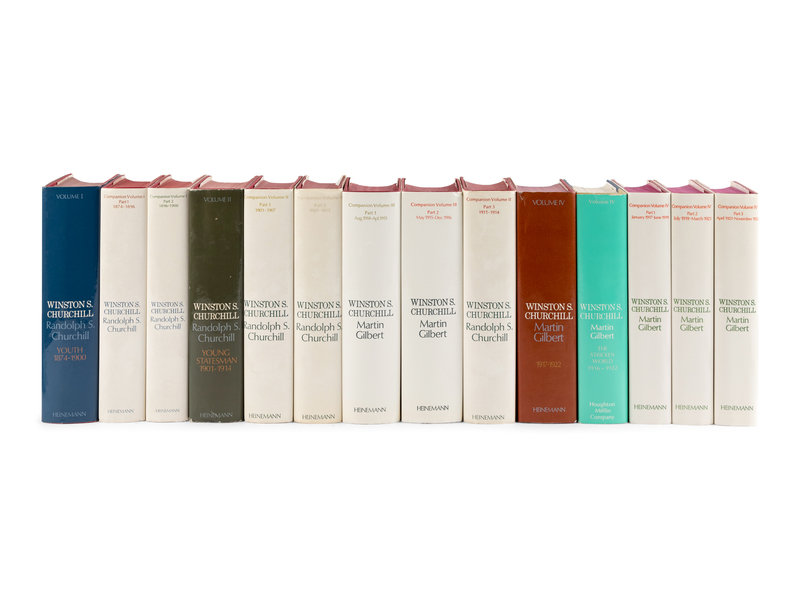 CHURCHILL, Randolph S. Winston S. Churchill: Youth 1874-1900. London: William Heinemann Ltd., 1966. Publisher's cloth; original dust jacket. FIRST EDITION. -- CHURCHILL, Randolph S. Winston S. Churchill: Young Statesman 1901-1914. London: William Heinemann Ltd., 1967. Publisher's cloth; original dust jacket. FIRST EDITION. -- GILBERT, Martin. Winston S. Churchill: The Stricken World 1916-1922. Boston: Houghton Mifflin Company, 1975. Publisher's cloth; original dust jacket. FIRST AMERICAN EDITION. -- GILBERT, Martin. Winston S. Churchill: 1917-1922. London: William Heinemann Ltd., 1975. Publisher's cloth; original dust jacket. FIRST EDITION. -- And 4 others. Together, 8 works in 14 volumes, 8vo, condition generally fine. Complete list available upon request.