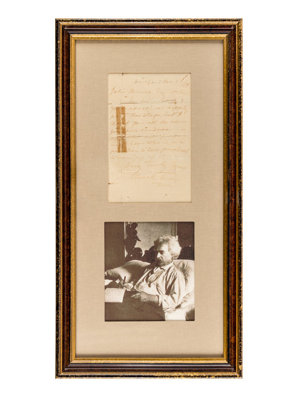 In full: "Dear John, My twins (born 3 years apart) are happily past that stage, but I thank you all the same for your kindness as does our [?...] neighbor who is in a position to take practical advantage of it. Very truly yours, Mark Twain." Presumably written by Clemens in response to a letter from Munro, of New Brunswick Canada, written on 20 December 1879, in which Munro hears that Clemens is "troubled with twins" and encloses something on how to raise them successfully (that letter not present in this lot, see University of Virginia's Guide to the Papers of Mark Twain held in the Clifton Waller Barrett Library Special Collections).