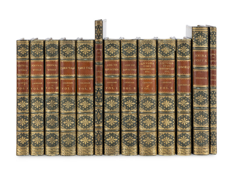 Specimens of the Table Talk. L: John Murray, 1835. 2 volumes. Lithographic frontispieces. FIRST EDITION. -- The Poetical Works. L: William Pickering, 1835. 3 volumes. Later edition. -- Aids to Reflection. L: William Pickering, 1848. 2 volumes. Sixth edition. -- Notes and Lectures upon Shakespeare. L: William Pickering, 1849. 2 volumes. FIRST EDITION. -- A Dissertation on the Science of Method; Or, the Laws and Regulative Principles of Education. London and Glasgow: Richard Griffin and Company, n.d [but advertisements dated November 1859]. Seventh edition. -- Osorio a Tragedy. L: John Pearson, 1873. FIRST EDITION. -- Anima Poetae from the Unpublished Note-Books. L: William Heinemann, 1895. FIRST EDITION. -- Hints Towards the Formation of a More Comprehensive Theory of Life. Seth B. Watson, editor. L: John Churchill, 1898. Later edition.