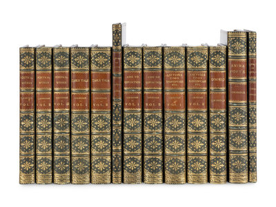 Together, 8 works in 13 volumes, various 12mo and 8vo sizes (198 x 121 mm, or smaller), half-titles to most volumes. (Slight mostly marginal toning, some occasional light spotting, a few leaves with short tears not affecting text.) Uniform contemporary blue polished calf, sides gilt-ruled, spines in 6 compartments with 5 raised bands, tan morocco lettering-pieces gilt in 2, the rest gilt-decorated, top edge gilt, others uncut, stamp-signed by Riviere & Son (a few hinges or joints starting, slight wear to extremities and sides with a few scuffs, spine cover at the head of vol. II of Lectures detaching).