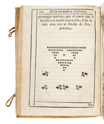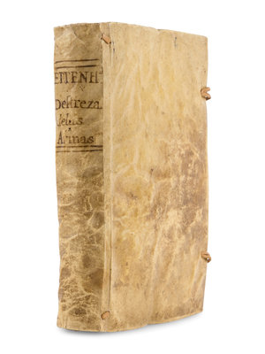 Small 4to (185 x 137 mm). Title printed within decorative border; engraved allegorical frontispiece, 18 engraved plates; text printed within double rule border. (Dampstained, a few leaves with marginal repairs occasionally crossing text or image, one leaf with marginal paper flaw, final leaf backed.) Contemporary limp vellum hand-lettered on spine, leather ties and catches (some soiling). Provenance: Early annotations crossed out on front free endpaper); "Garron" (early signature on title-page); Libreria de Cuesta Carretas a Madrid (small stamp on front free endpaper).