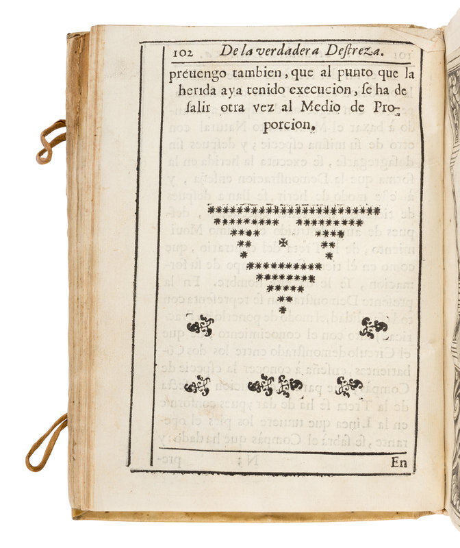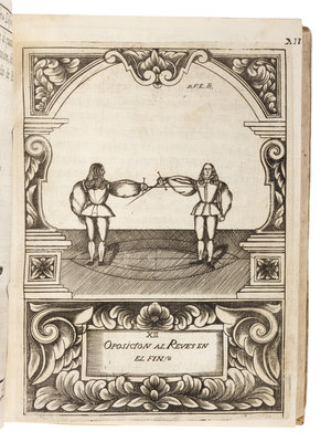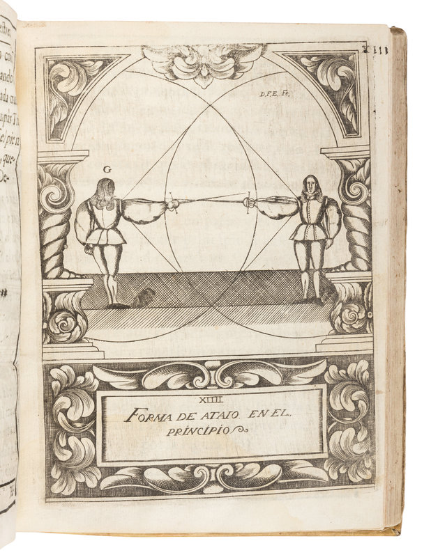 FIRST AND ONLY EDITION OF ETTENHARD'S RARE TREATISE, "typical of all Spanish manuals of the period, prefacing their instruction with an account of principles of geometry...minutely defining paces and passes, and encompassing all their figures within intricate diagrams of circles in all planes, of chords, and of tangents" (Castle). The illustrations are by Ettenhard himself, who was a Knight in the Order of Calatrava and who served King Charles II of Spain as Lieutenant Captain of the Royal German Guard. Pardoel 170; Thimms p.95.