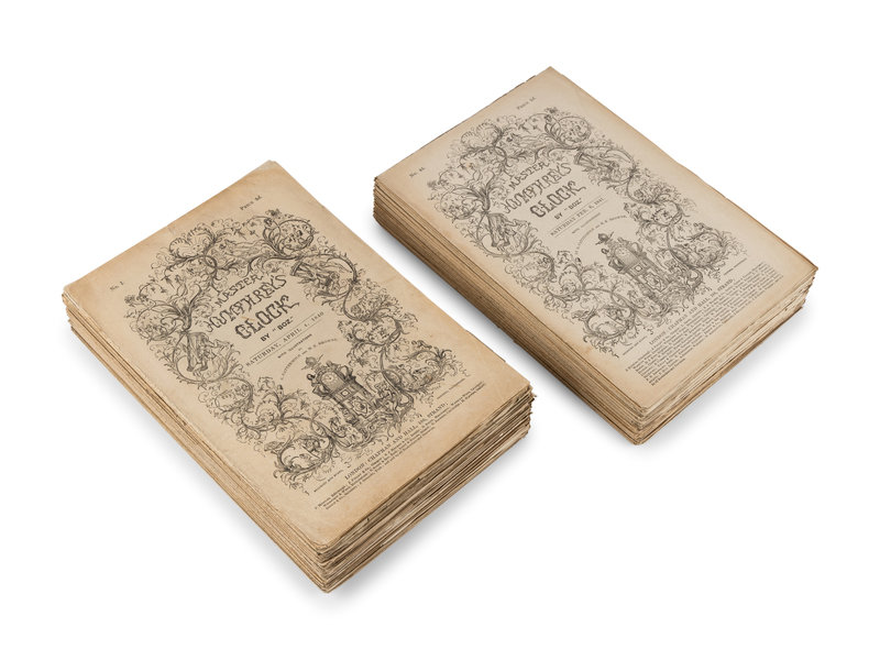 88 weekly parts, 8vo. 3 frontispieces and numerous wood engravings by George Cattermole, Hablot K. Browne (“Phiz”) and others. (Slight chipping, a few short tears occassionally affecting text.) Original pictorial printed white self-wrappers, uncut (slight soiling, some chipping and tearing occasionally affecting text); slipcases. Provenance: various effaced signatures to a few parts; Edith Taylor ("The Glen" bookplates).