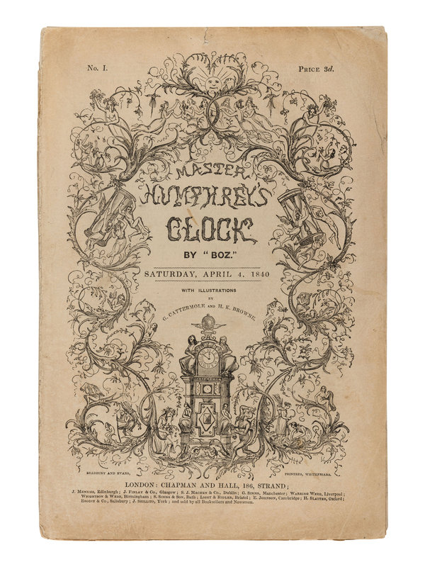 FIRST EDITION, IN THE ORIGINAL 88 WEEKLY PARTS, also including FIRST EDITIONS of The Old Curiosity Shop and Barnaby Rudge. With preliminaries (frontispiece, title-page, and Preface) for the 3-volume edition present in numbers 26, 52, and 88; addresses by the author in numbers 9, 80-83, and 87. Each weekly part was issued as a single folded sheet of 16 pages, 4 of which formed the outer wrapper around 12 numbered pages of letterpress. "Of the four issues the weekly one is difficult to obtain in a clean condition and is therefore the costliest" (Eckel). All 88 parts include front wrappers with an engraved design by George Cattermole which was engraved in wood by E. Landells. One of the first works to be published in both weekly and monthly parts, a strategy which proved unsuccessful. Eckel, pp. 61-65; Hatton & Cleaver, pp. 161-182.