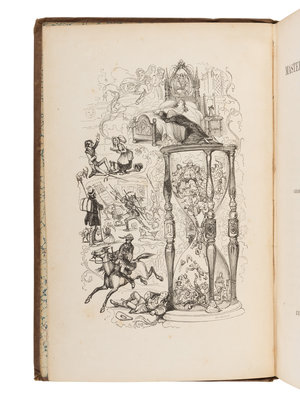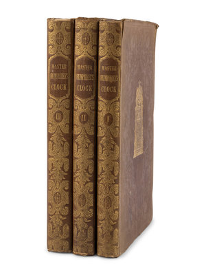 3 volumes, 4to (256 x 168 mm). 3 frontispieces, and numerous wood-engraved illustrations by George Cattermole and by Hablot K. Browne (“Phiz”). (Vol. I lacking the dedication leaf, some occasional light staining and creasing, slight marginal toning.) Original brown cloth decorated in blind and gilt, upper covers with central gilt clock with hands signifying the volume number, marbled edges, with red, green, and blue hair-vein marbled endpapers (spines slightly darkened, some minor staining, hinges just starting). Provenance: signature to part 1 front flyleaf; Noel Charles Peyrouton, Associate editor of the Pilgrim Edition of Dickens's Letters (bookplates laid in).