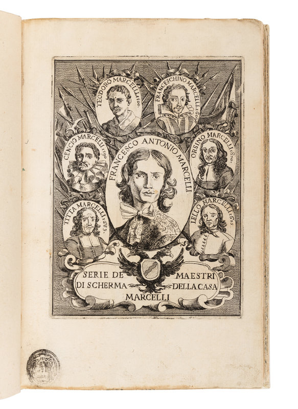 FIRST EDITION OF MARCELLI'S RARE TREATISE, dedicated to Christina Alexandra, daughter of Gustav II Adolf and Maria Eleonora of Brandenburg, who ruled as queen of Sweden until her abdication in 1654. The Marcelli family were a dynasty of fencing masters, 7 of whom are depicted in the frontispiece of the present work. The illustrations are after designs by the author.