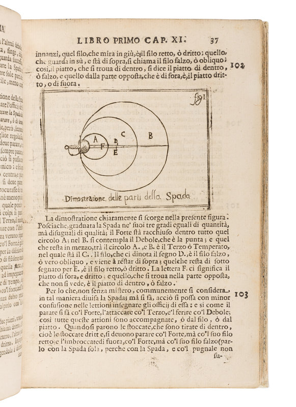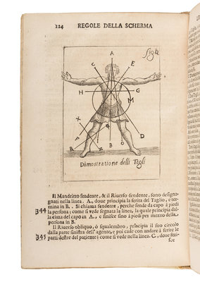 2 parts in one volume, small 4to (216 x 144 mm). Engraved frontispiece depicting fencing masers of the Marcelli family, engraved coat of arms of Sweden on title-page; 34 engraved illustrations in-text. Later vellum. Provenance: Apparteneva alla Libreria Bandi, ora di R[inaldo] Buti (booksellers' label to front pastedown, ca 1840); unidentified stamp on frontispiece.