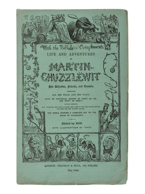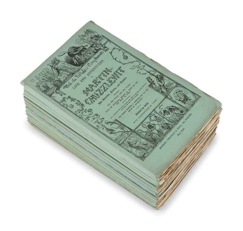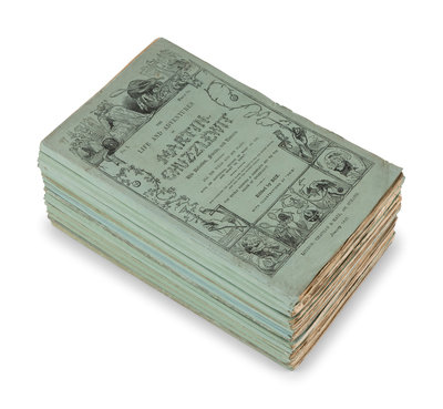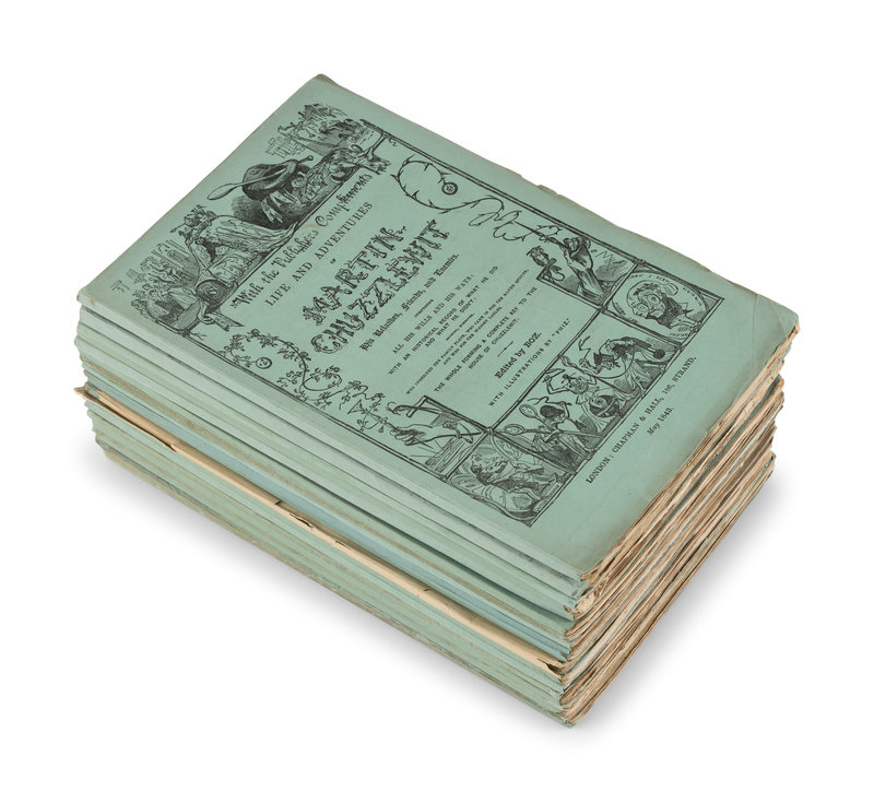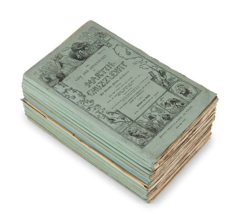 FIRST EDITION IN ORIGINAL MONTHLY PARTS, FIRST ISSUE. PUBLISHER’S PRESENTATION COPY, part 5 front wrapper stamped “With The Publisher’s Compliments." With the following first issue points: the back wrapper of part 19/20 with the additional 2 lines at the foot ("A few copies in splendid scarlet binding, adapted to the drawing-room table, or forming an elegant souvenir" with "scarlet" not mentioned by Hatton and Cleaver); the engraved vignette title-page in the first impression with the reversed "100£," 7 studs in the trunk lid, and signed "Phiz fecit," but with the later 14-line errata. NEARLY COMPLETE WITH ALL TEXT, PLATES, WRAPPERS, SLIPS, AND ADVERTISEMENTS as called for in Hatton & Cleaver and in the first issue, except for: the rare and lacking "Foreign Travel" 2pp. slip in part 7 (noted in only 6 copies by Hatton and Cleaver); lacking "The 'Pride of London'" 32pp. back advertisement in part 11; lacking "The Temple of Fashion" 32pp. booklet at the end of part 16. Eckel, pp. 66-70; Hatton & Cleaver, pp. 183-212; Smith pp. 65-67.