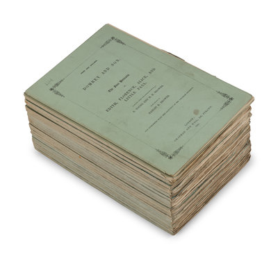 FIRST EDITION, IN THE ORIGINAL MONTHLY PARTS, early issue, with the earliest 2-line errata in part 19/20, with "Delight" twice mentioned instead of "Joy" on p. 284 of part 9, "if" lacking on p. 426 (line 9) as in the earliest issue, but with the later "431" pagination present in part 14, and "Captain" spelled correctly in the last line on p. 324 in part 11. This set has textual errors not mentioned in Hatton and Cleaver, as follows: "Octo 1847" is printed on p. 1 of the Advertiser in part 13; the dedication in part 19/20 is to "The Marchioness of Normanby [sic]" rather than "Normandy." With all text, plates, wrappers, slips, and advertisements present and will all the first issue points as called for in Hatton & Cleaver except for the following: the part 16 back outside wrapper is not in the first issue; parts 3, 15, 17 and 18 each lack a slip in the front advertisements; the back advertisements are lacking in parts 4 and 11, at least one advertisement is lacking in parts 9, 15, and 17. Additionally, this set has several advertisements bound into different parts than called for as follows: the 1p. "In December will be published" slip called for at the front of part 2 (lacking) but is bound in at the end of part 1 (not called for); the 4pp. advertisements called to precede the Advertiser in part 3 (lacking) are present at the end of part 2 (not called for); the 4pp. "Cheap Edition… Mr. Charles Dickens" with the third line reading "Now Publishing" slip is called for at the front of part 7 (lacking), but is bound in at the end of part 6 (not called for); part 12 has an additional 4pp. slip "Cheap Edition… Sir Edward Bulwer Lytton" not called for bound in at the end. Hatton & Cleaver, pp. 227-250; Yale/Gimbel A102.