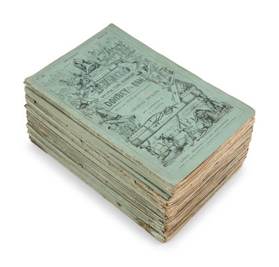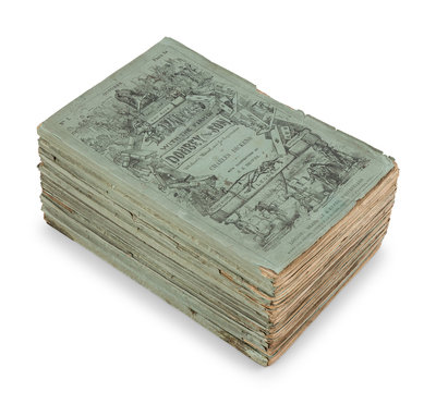 20 parts in 19, 8vo. Etched frontispiece, vignette title, and 38 etched or lithographic plates by and after Hablot K. Browne (“Phiz”). (Some toning and minor spotting, slight offsetting.) Original green pictorial printed wrappers, uncut and a few partially unopened (a few spines with some chipping and old repairs, slight soiling); slipcase. Provenance: Various signatures or annotations to a few parts; Hale & Roworth Stationers (their ticket part 14 front wrapper).