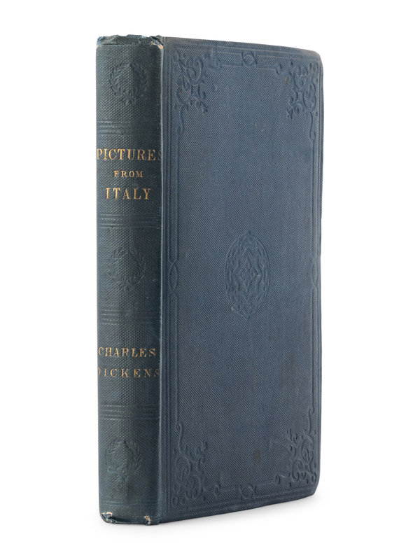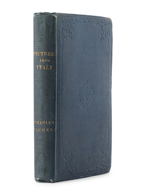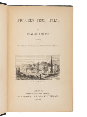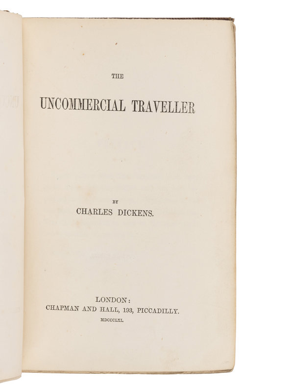 [With:] DICKENS, Charles. The Uncommercial Traveller. London: Chapman and Hall, 1861. 8vo (191 x 121 mm). Half-title, 32pp. publisher's advertisement at end dated December 1860. (Some occasional light spotting and minor soiling.) Original wavy-grain violet cloth decorated in blind, spine gilt-lettered, uncut (hinges starting, a touch of wear to extremities); slipcase. Provenance: Tho. J. Dadsforth (contemporary signature); bookseller's description to front pastedown. FIRST EDITION IN BOOK FORM, published on 15 December 1860. With all the first issue points called for by Smith, except the dot over "it" is present on p. 192, 3 lines up (not present in some copies), and the spacing is proper in "him" in line 3 of p. 247. Dickens initially published this series of seventeen sketches in All the Year Round earlier in 1860. Eckel, p. 132; Smith II:11; Yale/Gimbel A145.