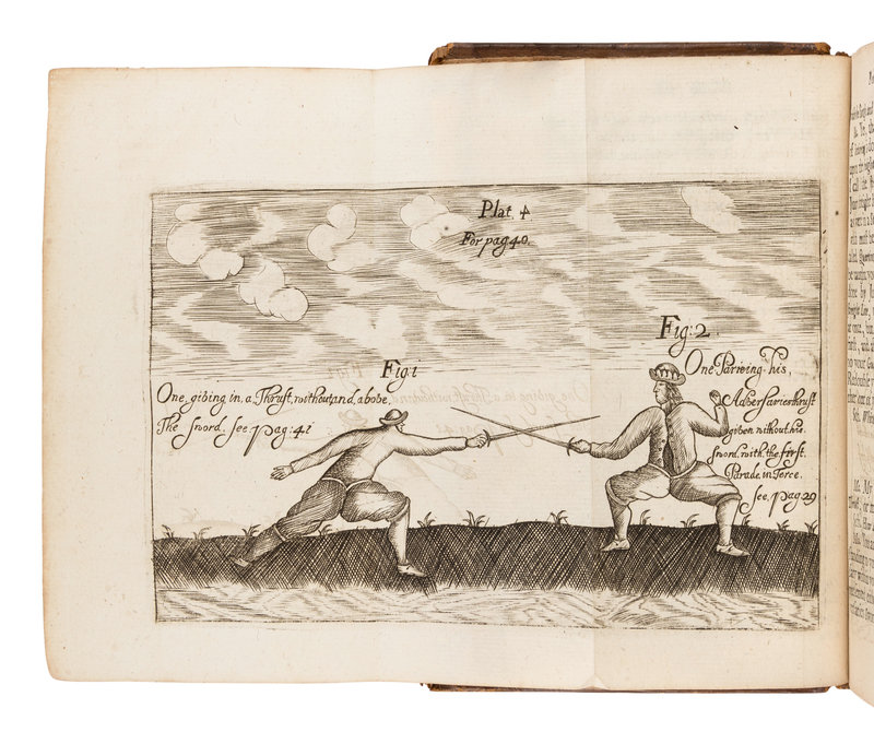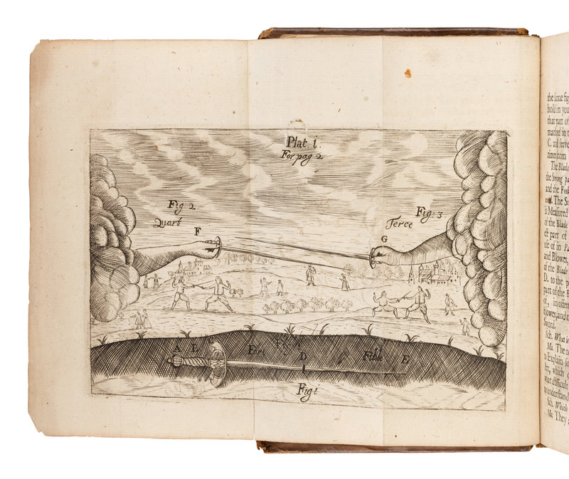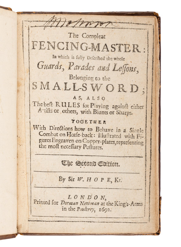 HOPE, William, Sir (1664-1729). The Compleat Fencing-Master: In which is fully Described the whole Guards, Parades and Lessons belonging to the Small-Sword; as also the best rules for playing against either artists or others, with blunts or sharps. London: for Dorman Newman, 1692.