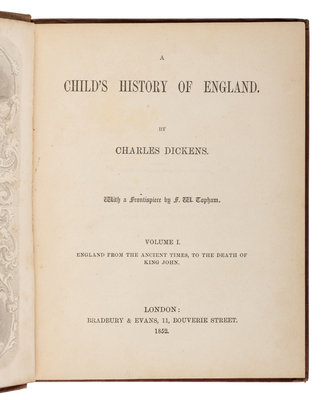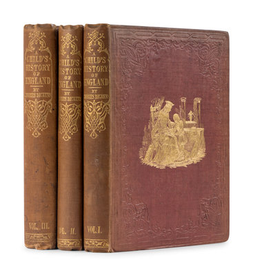 FIRST EDITION IN BOOK FORM, FIRST ISSUE, with advertisements in the first state and all the first issue points called for by Smith, except for the following: "whom" is correct in line 5 of p.[v] in vol. I (Smith states it "may" be missing); "A" is fully printed in the headline on p. 42 in vol. I as in all but one copy; "6" is present in the page number on p. viii Chapter XXV in vol. II (Smith states it "may" be missing); the protective tissue is in vol. III only; and "7" is present in the page number on p.287 of vol. III as in all but one copy. First serialized in Household Words between 25 January 1851 and 10 December 1853, each volume of this book edition was published separately around Christmas (in 1851, 1852 and 1853) but postdated the following year. The Child's History expresses an anti-aristocratic and anti-monarchical view of English history and society. Eckel (1972), pp. 128-130; Gimbel A128; Smith II: 10.