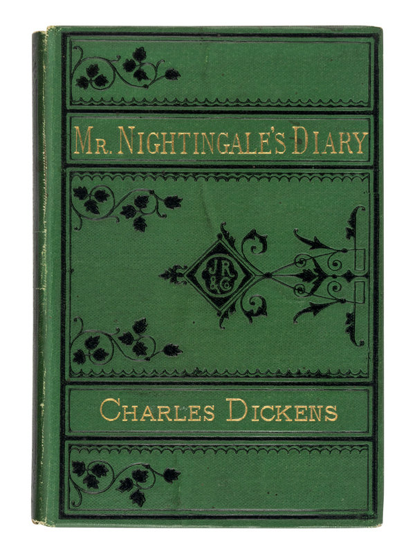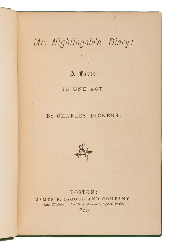[With:] DICKENS. Mr. Nightingale's Diary: A Farce in One Act. Boston: James R. Osgood and Company, 1877. 16mo (120 x 82 mm). Publisher's advertisement endpapers. Original green cloth decorated in black and gilt-lettered (spine darkened, slight wear, covers starting); slipcase. Provenance: previous bookseller's description tipped to front pastedown. FIRST AMERICAN EDITION, preceded by the original edition, privately printed in 1851, of which Eckel states only 3 known copies. Eckel (1913), pp. 184-185; Yale/Gimbel B215.